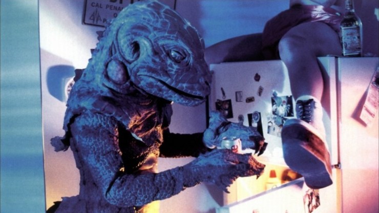 Nowhere se concentra en las incidencias del último día terrenal, del insospechado fin del mundo. Dark Smith, el nombre de nuestro masturbador, comienza a tener visiones de un extraterrestre que se esconde entre la humanidad. Es un tipo de reptil gigante que anda con una exagerada pistola láser. Nadie más puede ver esta extraña figura y Dark se cuestiona si es real o si es el efecto de todas las drogas que alberga en su sistema. La película nunca toma una decisión contundente al respecto. Lo que realmente importa es la experiencia sentida y no, necesariamente, la verificable.